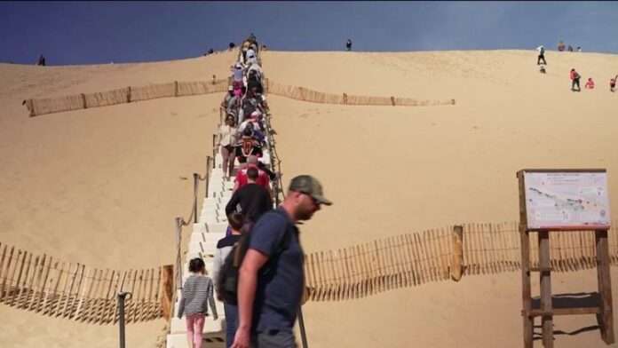 Durant le week-end de Pâques, les marches permettant d’accéder à la dune du Pilat ont rouvert au public. L’affluence était forte dès la réouverture.